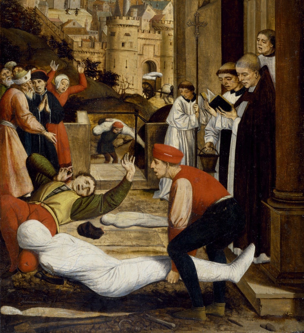 “Members of a household brought their dead to a ditch as best they could, without priest, without divine offices...great pits were dug and piled deep with the multitude of dead. And they died by the hundreds both day and night”